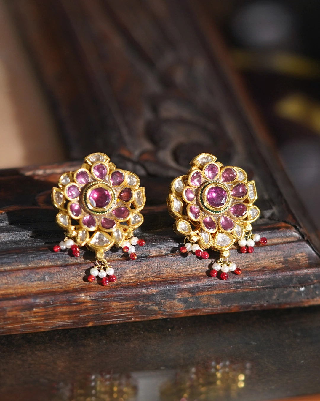 The Ila Ear Studs are meticulously handcrafted from gold, showcasing a striking 3D floral design. Each earring features a central element surrounded by open-set tourmaline and polki, enhancing the stones' refined sparkle and adding an antique charm. Compact yet intricately detailed, these studs are perfect for any occasion, whether worn alone or paired with the matching choker.