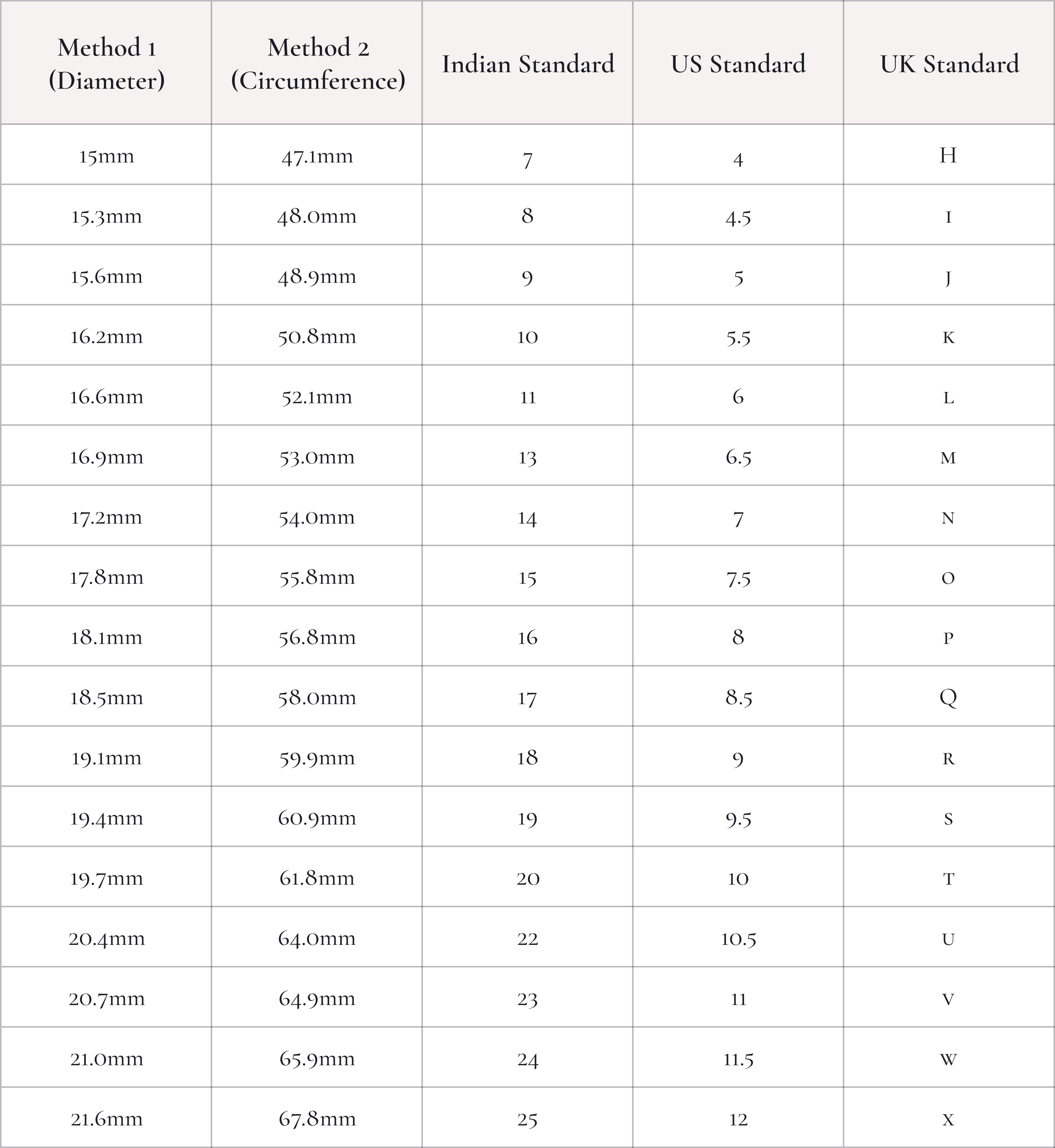 Now you have the inner diameter of the ring, use the following chart to determine your size.