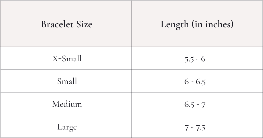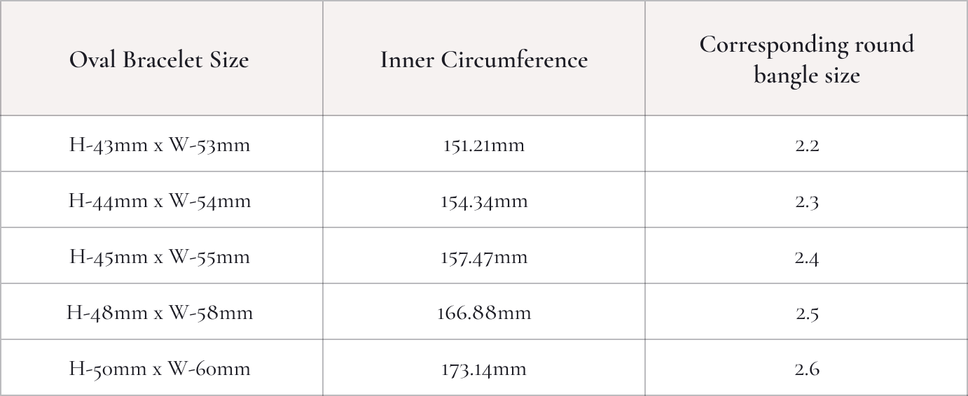 Measure the length and breadth of bangle and use the following chart to determine your bracelet size.